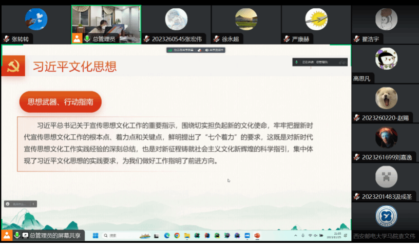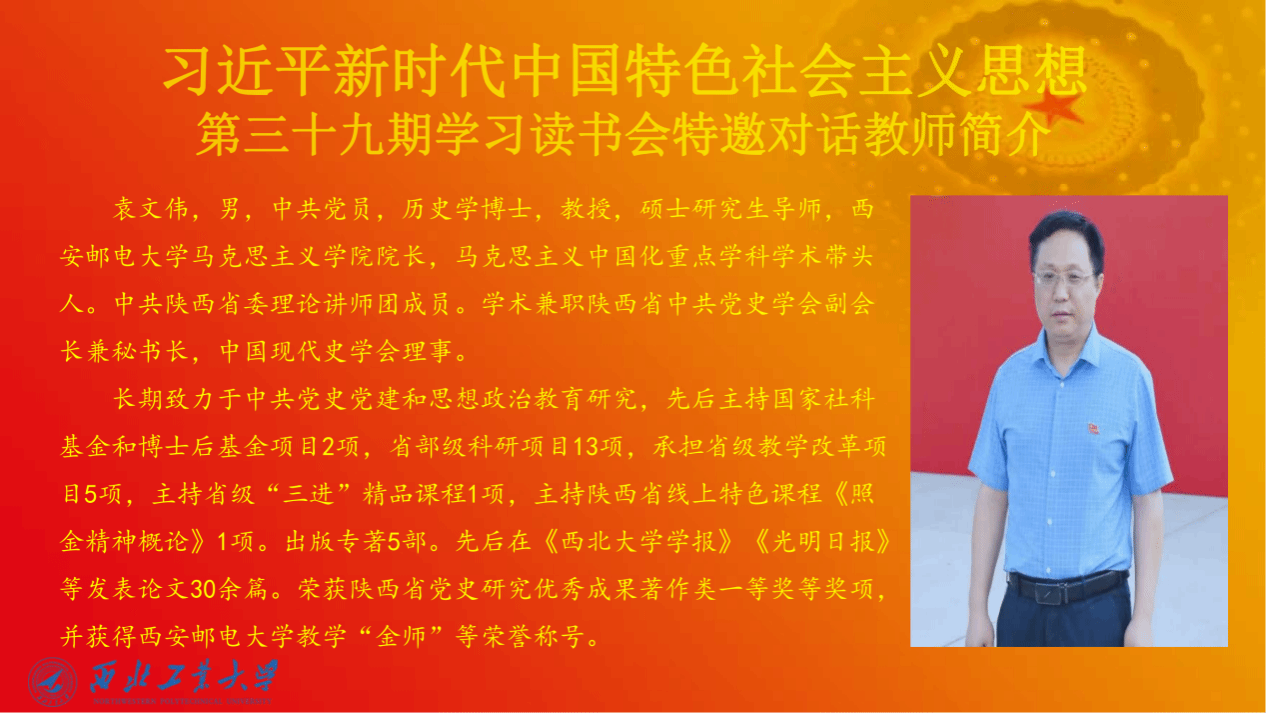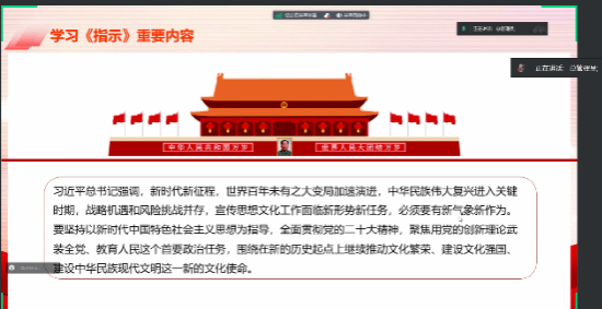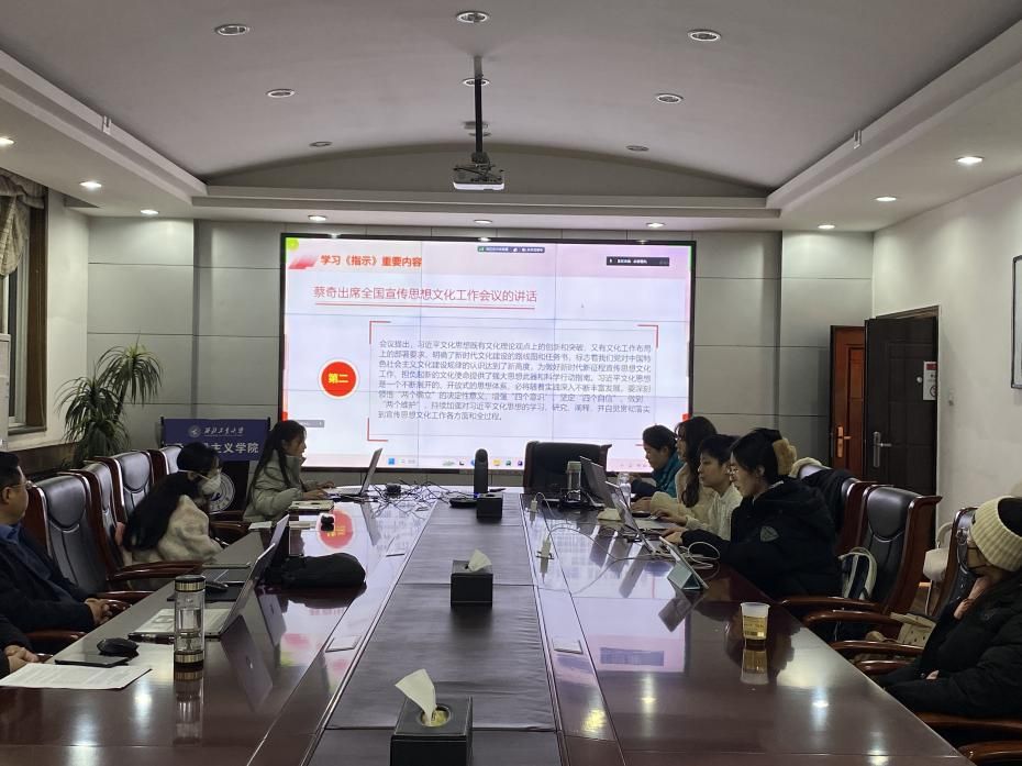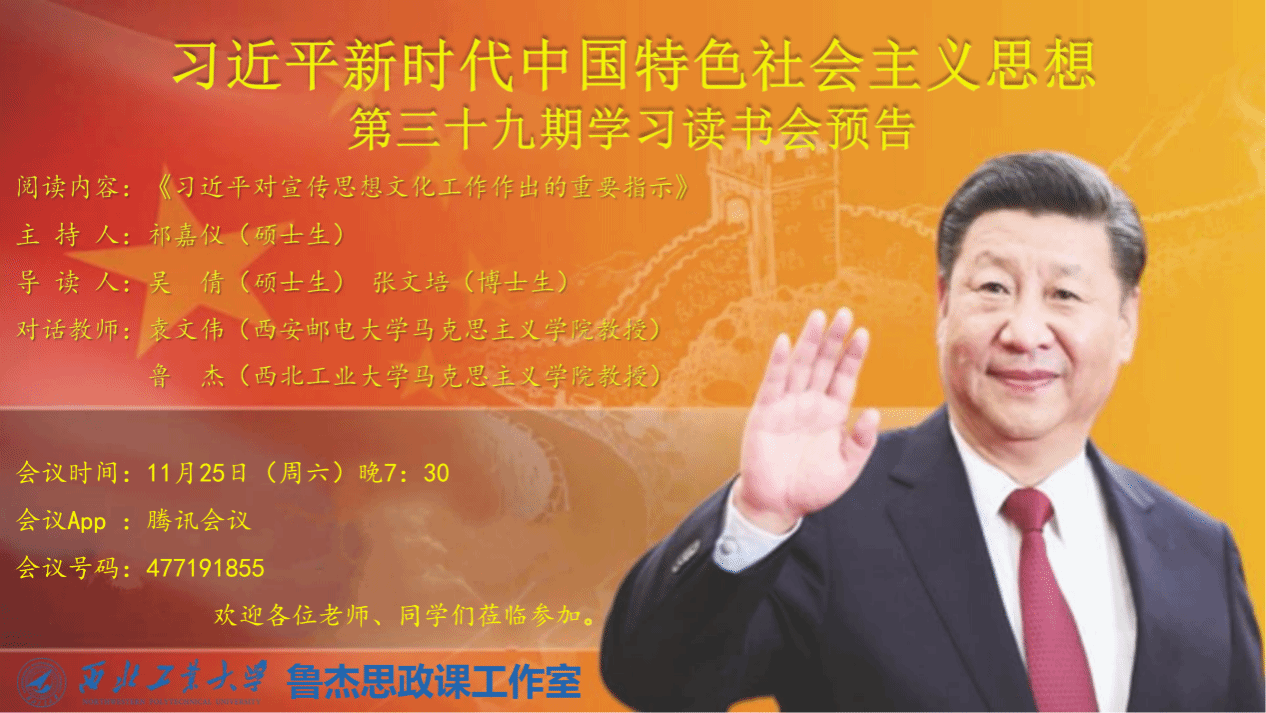 为全面学习贯彻党的二十大精神,推进习近平新时代中国特色社会主义思想进教材、进课堂、进头脑。2023年11月25日,beat365亚洲版官网习近平新时代中国特色社会主义思想学习读书会第三十九期活动主题围绕《习近平对宣传思想文化工作作出的重要指示》进行学习研讨。本次读书会由学院思想政治教育系主任、博士生导师鲁杰教授发起,学院硕士生祁嘉仪主持,西安邮电大学beat365亚洲版官网袁文伟教授作为对话教师应邀参加。本期读书会创新活动举办形式,首次采取线上线下相结合的方式,设置线下分会场,邀请导读同学、对话教师、硕士博士研究生在学院楼208会议室交流学习。