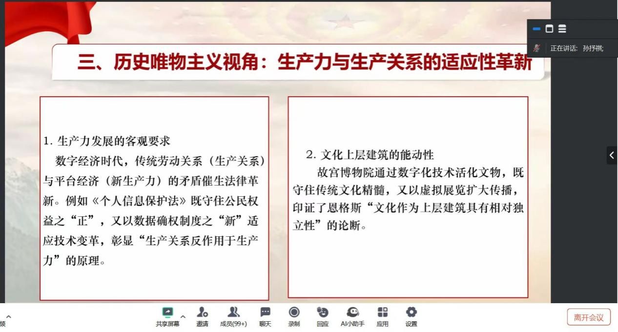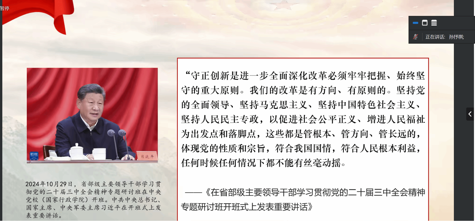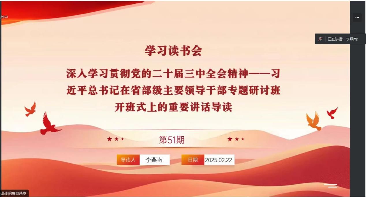 2025年2月22日,beat365亚洲版官网习近平新时代中国特色社会主义思想学习读书会第五十一期活动以《习近平在省部级主要领导干部学习贯彻党的二十届三中全会精神专题研讨班开班式上发表重要讲话》为主题进行学习研讨。本次读书会由beat365亚洲版官网鲁杰思政课工作室主办,大连海事大学邵芳强教授作为对话教师,硕士生李红霞同学主持,中国高等教育学会马克思主义研究分会督导组成员尉迟庆文同学应邀参与,通过线上交流与线下讨论相结合的形式,为师生们搭建了一个思想交流、智慧碰撞的平台。