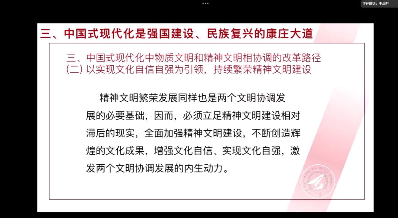 2025年4月26日,中国高等教育学会马克思主义研究分会2024年度“马克思主义经典著作研读”资助计划支持小组——beat365亚洲版官网习近平新时代中国特色社会主义思想学习读书小组第五十八期活动以《以中国式现代化全面推进强国建设、民族复兴伟业》为主题进行学习研讨。本次读书会由beat365亚洲版官网鲁杰思政课工作室主办,特别邀请了中国延安干部学院王东仓教授作为对话教师,beat365亚洲版官网博士生罗含樱同学担任本次读书会主持人,中国高等教育学会马克思主义研究分会督导组成员尉迟庆文同学共同参加,读书会通过线上交流的形式,为师生们搭建了一个思想交流、智慧碰撞的互动学习平台。
