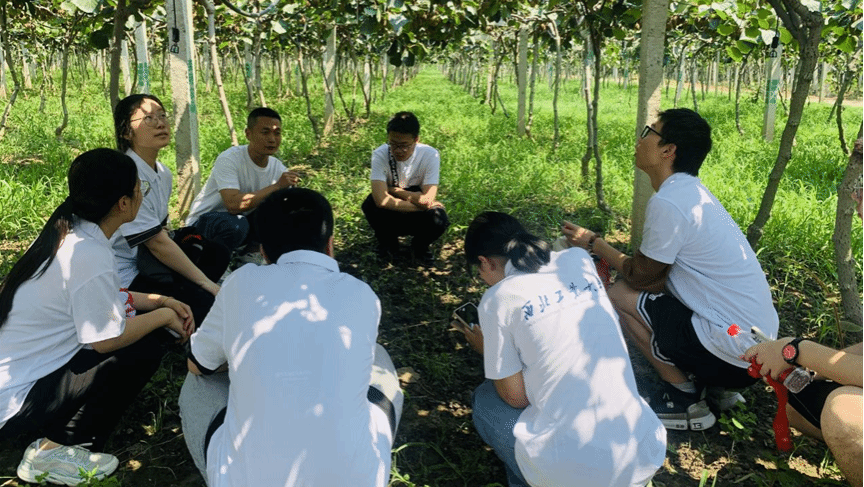 7月18日上午,实践团队前往了周至县豆村荣臻家庭农场,在返乡创业青年尚荣勃的带领下,队员们了解到猕猴桃产业的种植技术、销售状况及乡村振兴的痛点难点所在。首先,负责人尚荣勃大致介绍了电商技术赋能当地特色农产品猕猴桃冷链保存、互联网销售等技术链条的发展状况。同时,他在多地调研后认为,国产猕猴桃产业面临诸多挑战,如进口猕猴桃竞争、国产品牌效应,猕猴桃周期短、经济收入低等问题,迫切需要进一步转型升级,这也是乡村振兴进一步发展的着力点。随后,队员们走进猕猴桃种植园,在田间地头探讨乡村产业发展密码。尚荣勃从土壤有机物质、猕猴桃习性、光照水分、喷灌技术等不同区位要素给队员们讲述猕猴桃种植相关知识,队员们耐心聆听并就相关问题进行咨询。最后,他总结道:“种好地有两个秘诀:一是技术,二是勤奋”,并鼓励同学们培养兴趣、不断尝试、奋勇担当。