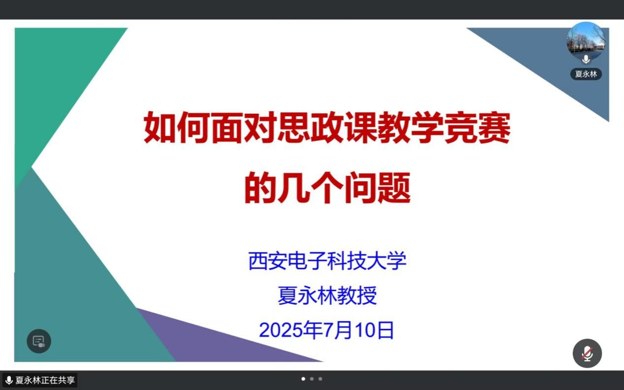 为助力学院教师精准把握思政课教学竞赛要求,提升思政课教师教学能力与参赛水平,7月10日上午,学院邀请西安电子科技大学beat365亚洲版官网夏永林教授以“如何面对思政课教学竞赛的几个问题”为题,开展了第36期以研促教Seminar专题讲座。本次会议由beat365亚洲版官网教务部、beat365亚洲版官网、陕西省教科文卫体系统职工创新工作室主办,西安工业大学、西安翻译学院、陕西青年职业学院、西安欧亚学院和陕西省重点舆情信息研究中心协办。讲座由beat365亚洲版官网副教授薛金慧主持。