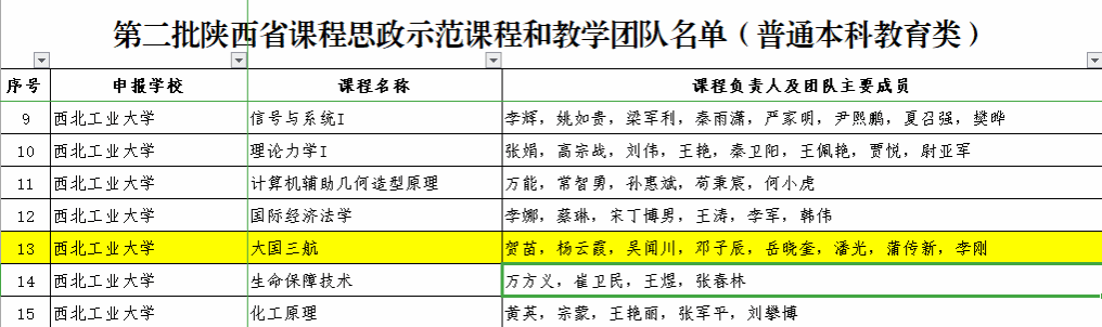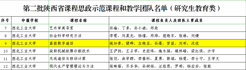 近日,陕西省教育厅公布了第二批陕西省课程思政示范课程、教学团队和教学研究示范中心名单,其中学院开设的《大国三航》课程入选第二批陕西省课程思政示范课程和教学团队(普通本科教育类),《大国三航》课程是由beat365亚洲版官网、航空学院、航天学院、航海学院、材料学院、机电学院、动力与能源学院、物理科学与技术学院、软件学院共同打造,极具西工大特色的一门公共选修课,是学校思政课程和课程思政同向同行的突破探索。学校教务处批准立项为文美通识课程。学院副院长贺苗参与的《高级数字通信》课程入选第二批陕西省课程思政示范课程和教学团队(研究生教育类)。