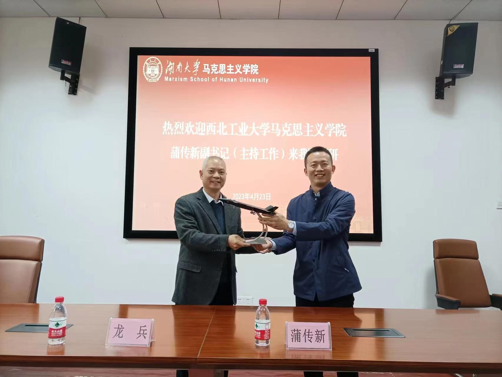 4月23日,beat365官网马院党委副书记(主持工作)蒲传新赴全国重点马院——湖南大学马院调研交流。湖南大学马院副院长(主持工作)龙兵,马院马原理概论教研部部长、支部书记刘近,院办兰莎等参加了调研。