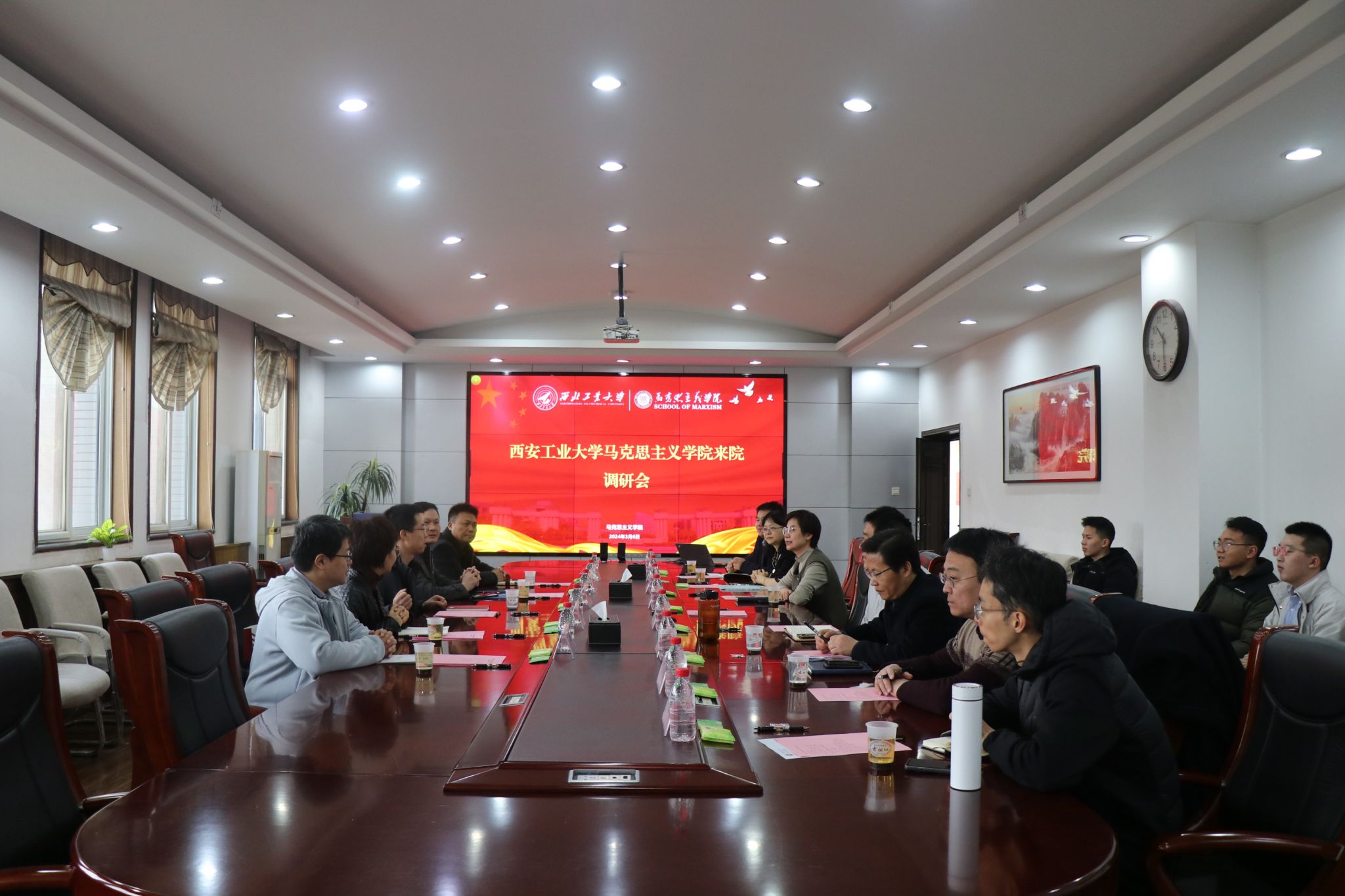 3月6日上午,西安工业大学beat365亚洲版官网院长梁华平一行来beat365官网beat365亚洲版官网调研。学院党委书记蒲传新、副书记李刚,副院长贺苗、德法与形势政策系主任胡建发、马克思主义中国化研究系教学主任华艳君、中国近现代史基本问题研究系教学主任房小捷、马克思主义基本原理系教学主任杨永强、思想政治教育系副教授代家玮及硕士生代表等参加了此次调研会。会议由副院长贺苗主持。