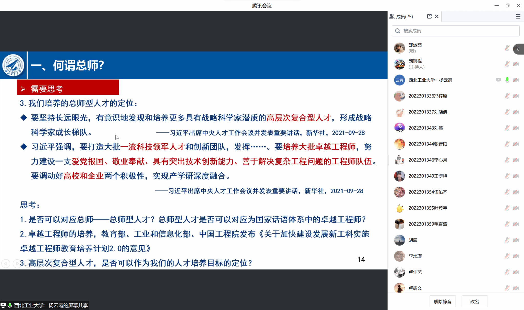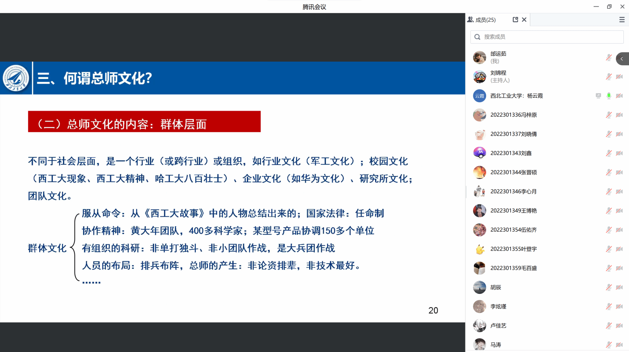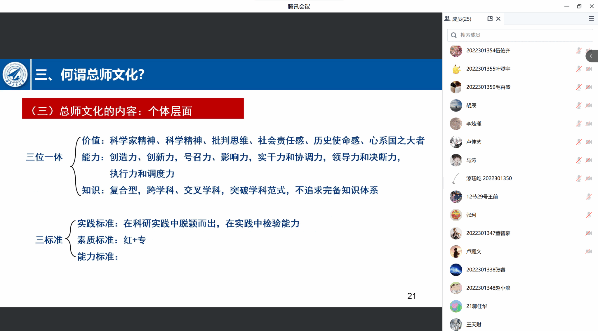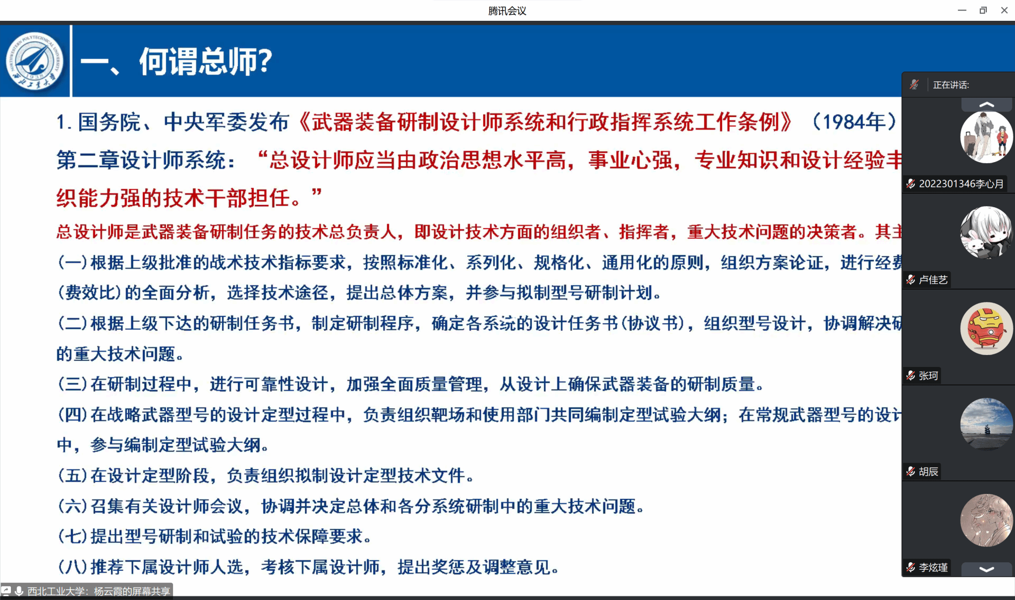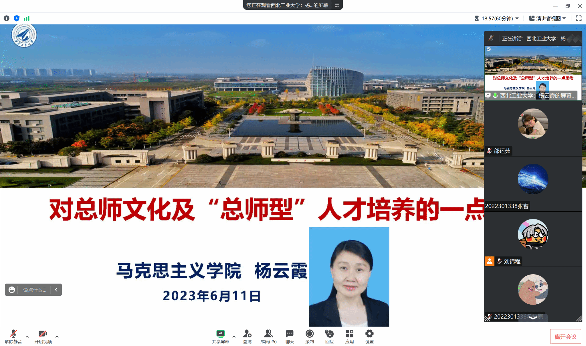 2023年6月11日上午8:30,beat365亚洲版官网院长杨云霞为其联系的DL032207班在线讲授了主题为“对总师文化及‘总师型’人才培养的一点思考”的思政课,班级25名同学全体参与并展开了研讨。